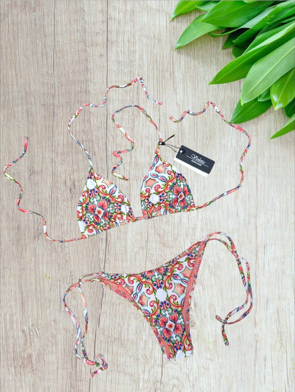 Costume donna a triangolo senza ferretto in fantasia delle bellissime maioliche vietresi in arancio . Slip brasiliana con Laccetti laterali