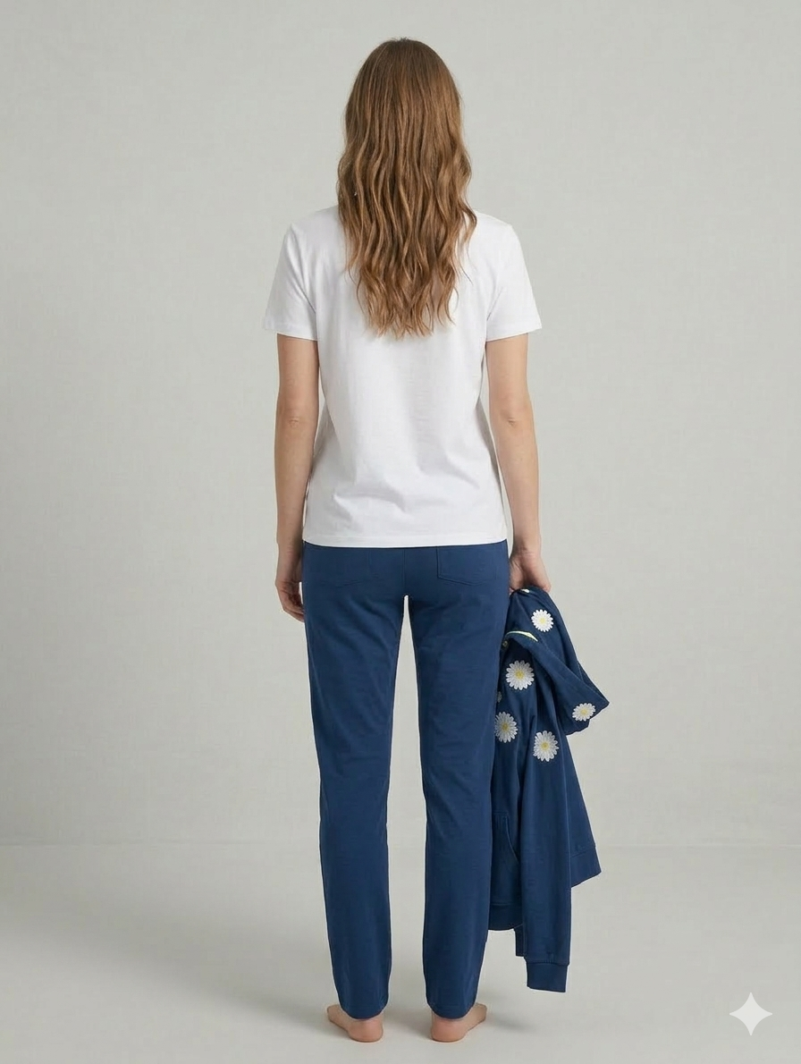 Pantalone lungo: Taglio dritto in coordinato blu navy, con elastico in vita per il massimo del comfort.